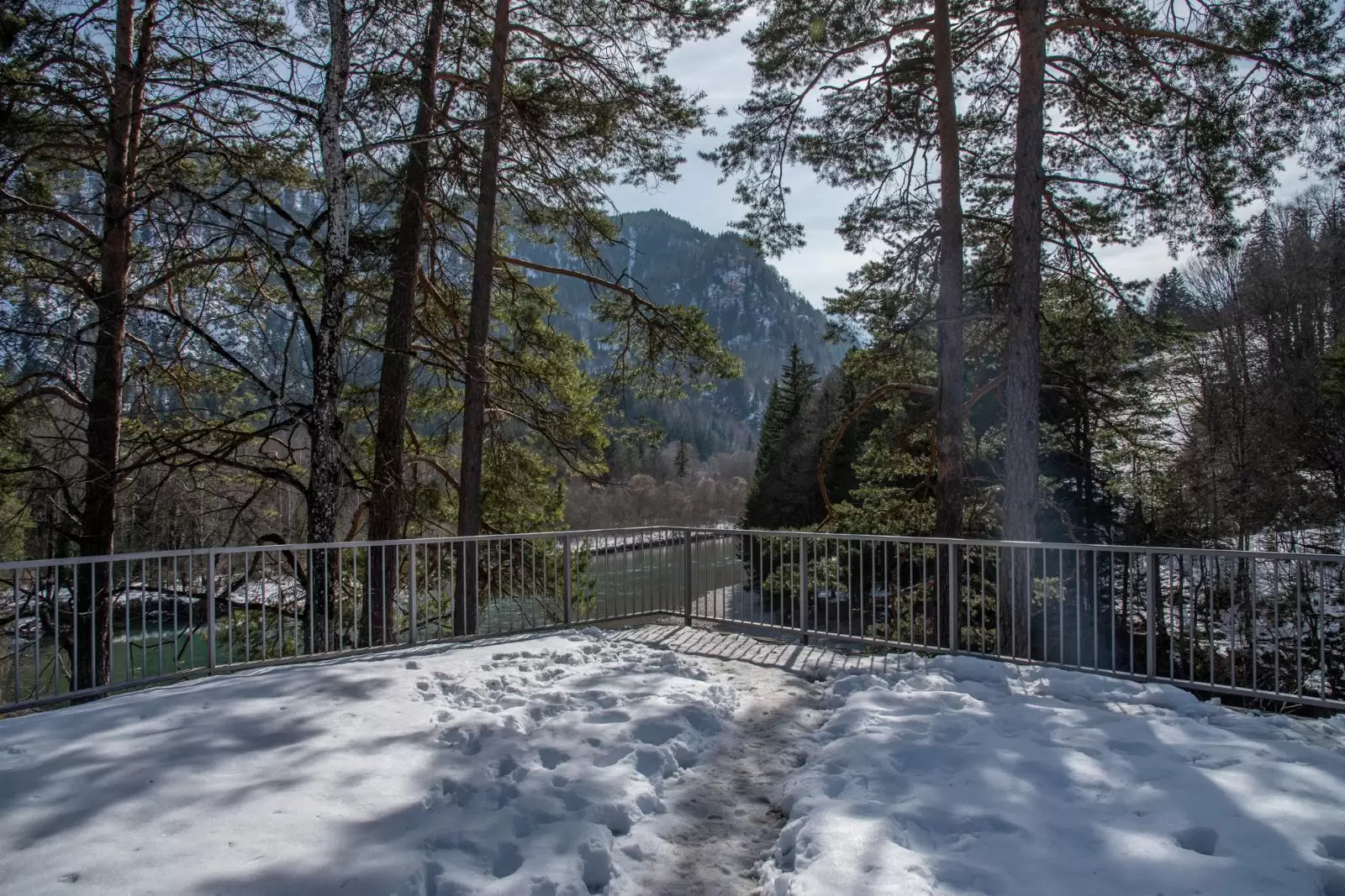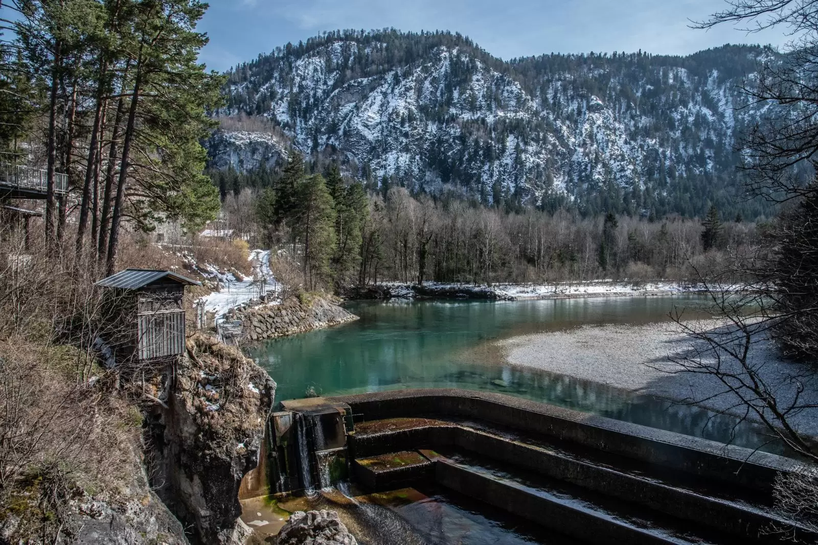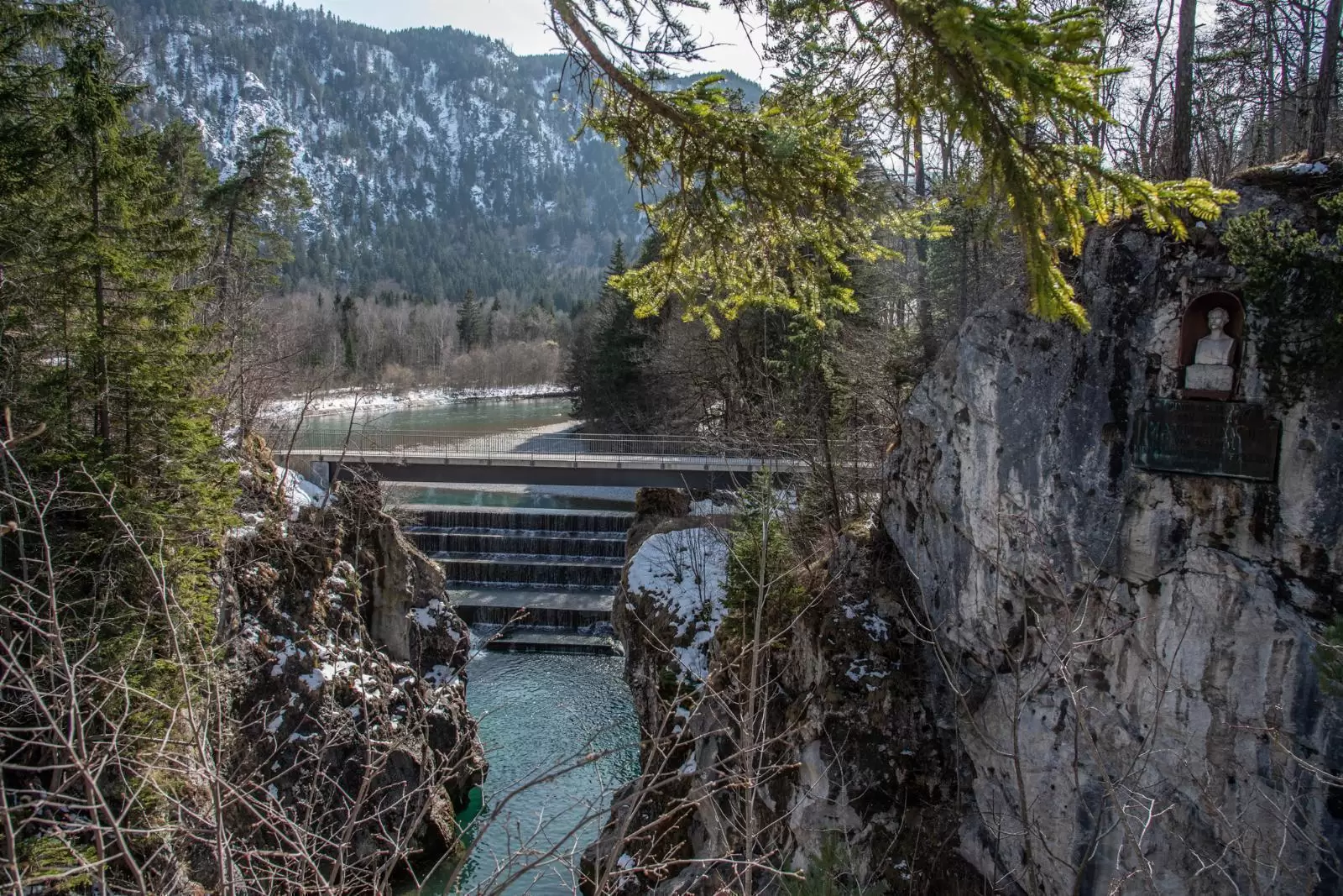 Wenn du dich umdrehst, bietet sich dir auf der anderen Seite ein ebenfalls beeindruckender Blick auf die Lechfall Klamm. Sie entstand über viele Jahrtausende, in denen sich der Lech einen Weg durch die Kalkfelsen bahnte. Die Lechschlucht bietet dir einen tollen Blick auf das grün schimmernde Wasser vor hellen Felsen. Den Blick wusste auch König Max von Bayern, der Vater von König Ludwig II., zu schätzen. Eine Büste zu seinen Ehren steht am Marienfelsen am Lechfall.