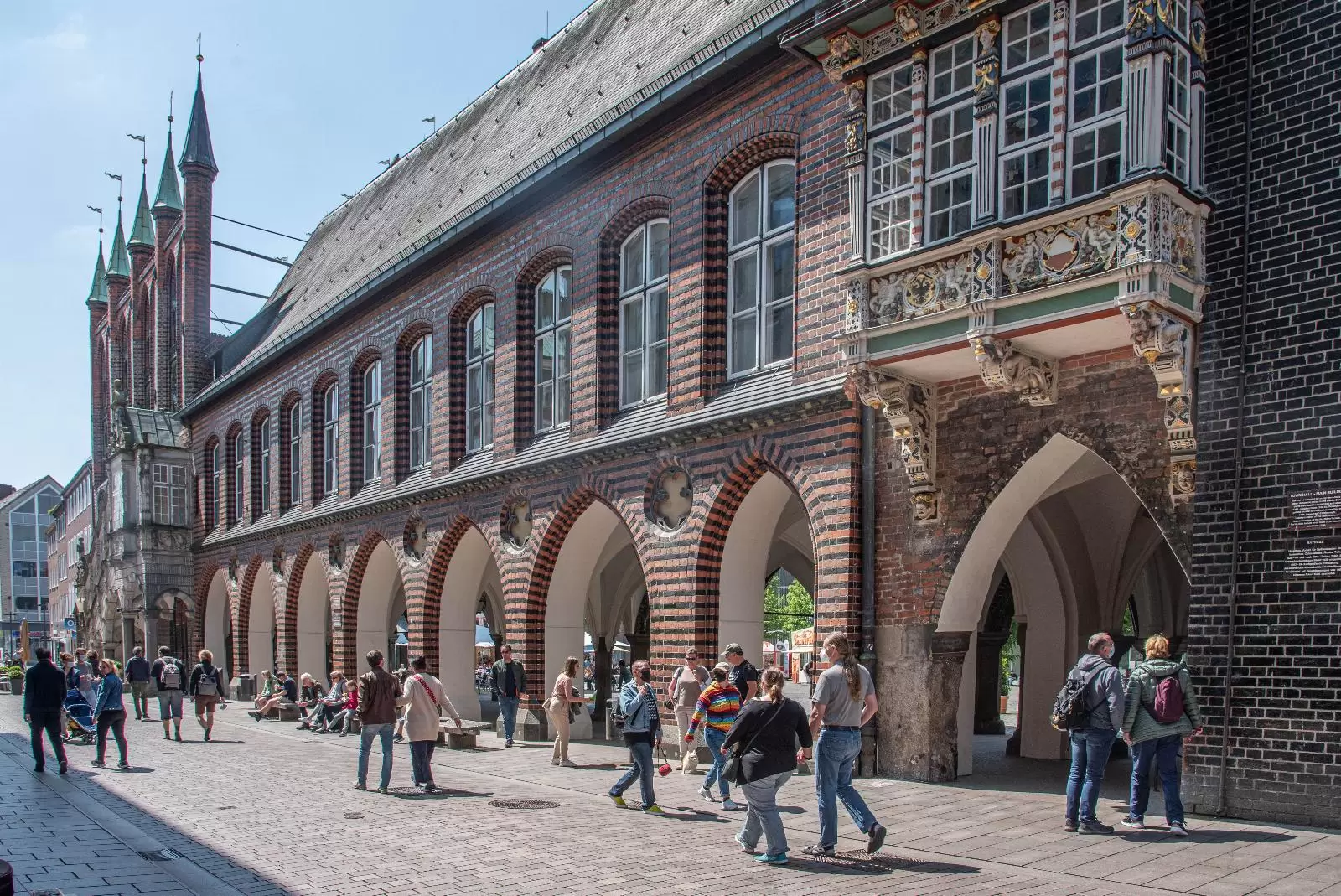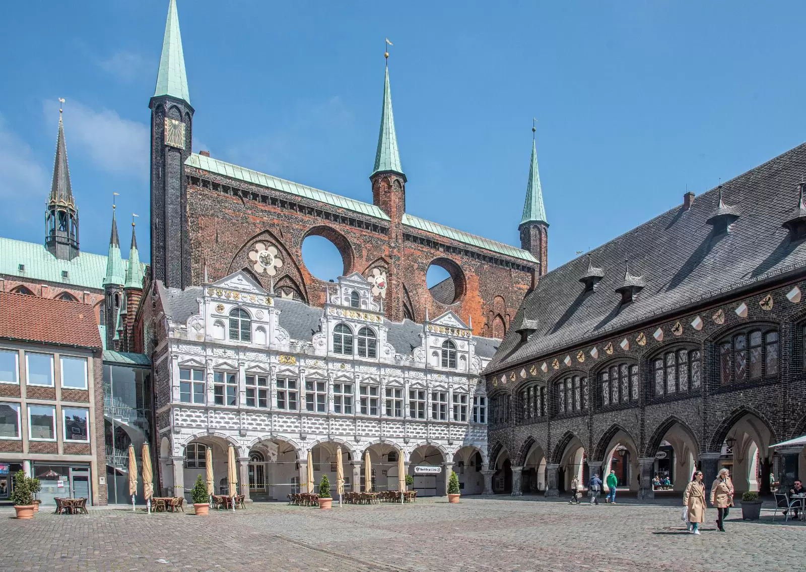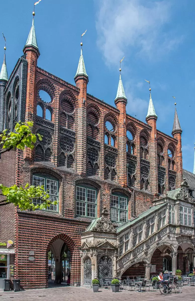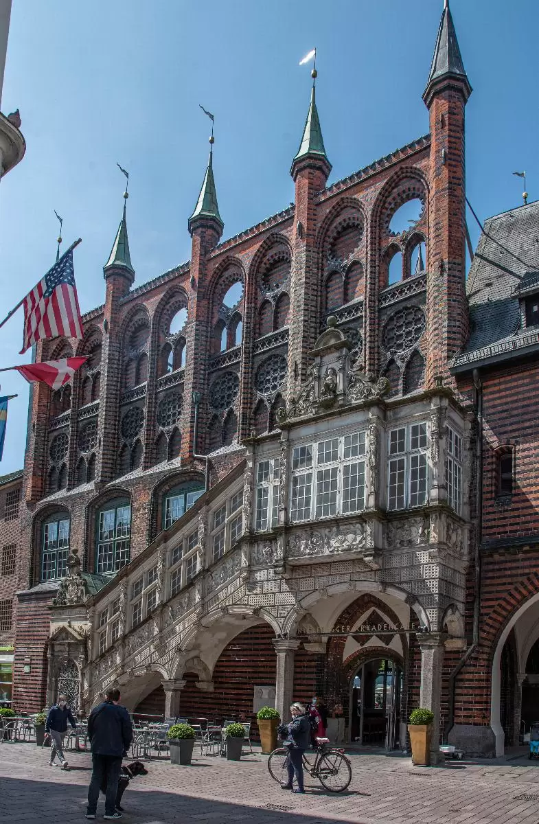 Zentral am Marktplatz befindet sich das Lübecker Rathaus aus dem Jahre 1230. Mit dem Bau wurde kurz nach der Verleihung der Reichsfreiheit begonnen. Seit seiner Vollendung im Jahr 1308 wurde das Gebäude bis heute durchgängig als Verwaltungssitz der Stadt genutzt. Im Laufe der Jahrhunderte wurde das Lübecker Rathaus allerdings oft umgebaut. So wurde Anfang des 19. Jahrhunderts der Hansesaal, in dem früher die Hansetage stattfanden, entfernt. Besonders ins Auge fallen neben der großen Schauwand die drei Türme sowie die kleinen dekorativen Balkone an der Fassade des Rathauses. Sehenswert sind auch die drei Kolossalgemälde im Innern des Gebäudes oberhalb der Freitreppe.
