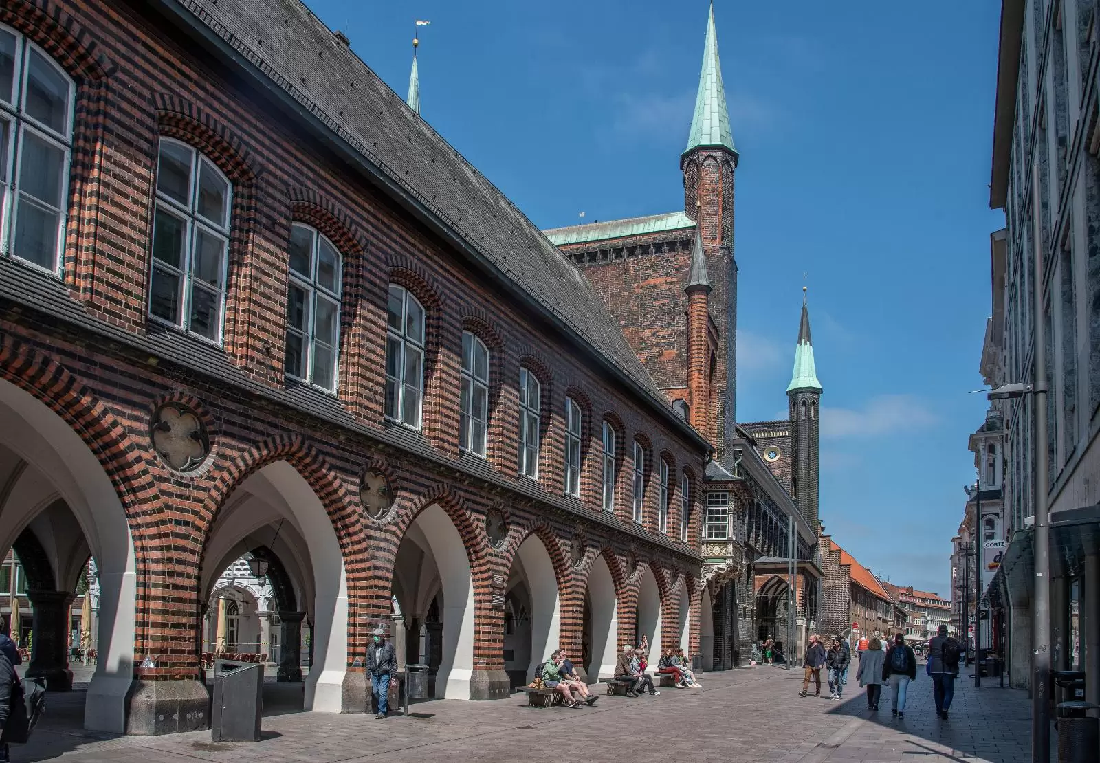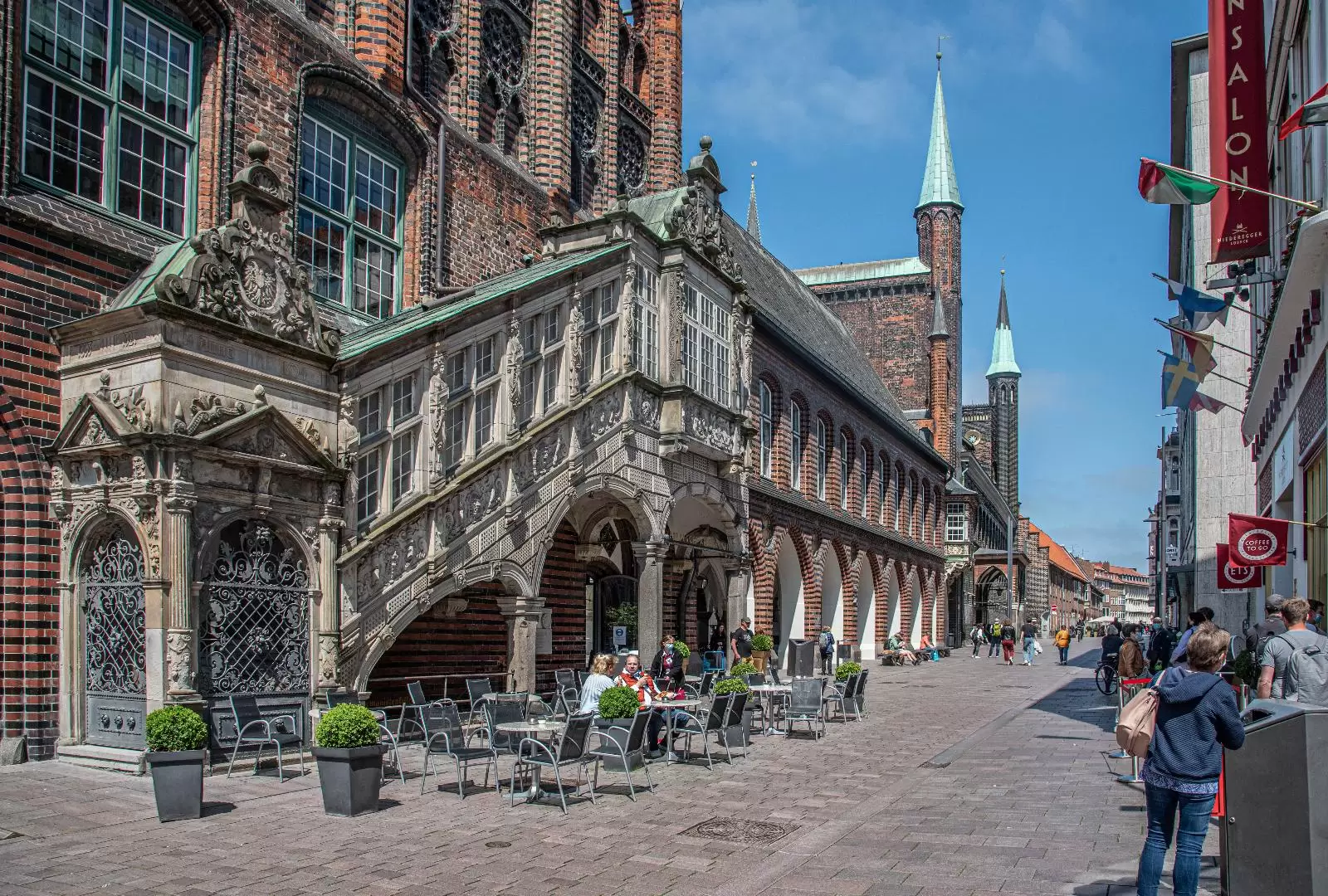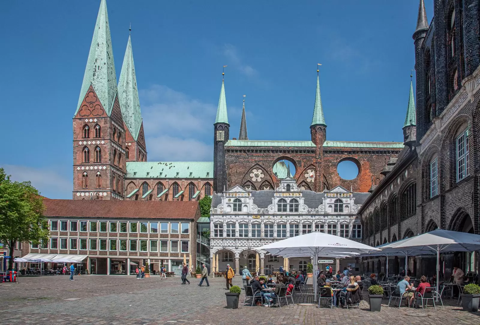 Zentral am Marktplatz befindet sich das Lübecker Rathaus aus dem Jahre 1230. Mit dem Bau wurde kurz nach der Verleihung der Reichsfreiheit begonnen. Seit seiner Vollendung im Jahr 1308 wurde das Gebäude bis heute durchgängig als Verwaltungssitz der Stadt genutzt. Im Laufe der Jahrhunderte wurde das Lübecker Rathaus allerdings oft umgebaut. So wurde Anfang des 19. Jahrhunderts der Hansesaal, in dem früher die Hansetage stattfanden, entfernt. Besonders ins Auge fallen neben der großen Schauwand die drei Türme sowie die kleinen dekorativen Balkone an der Fassade des Rathauses. Sehenswert sind auch die drei Kolossalgemälde im Innern des Gebäudes oberhalb der Freitreppe.