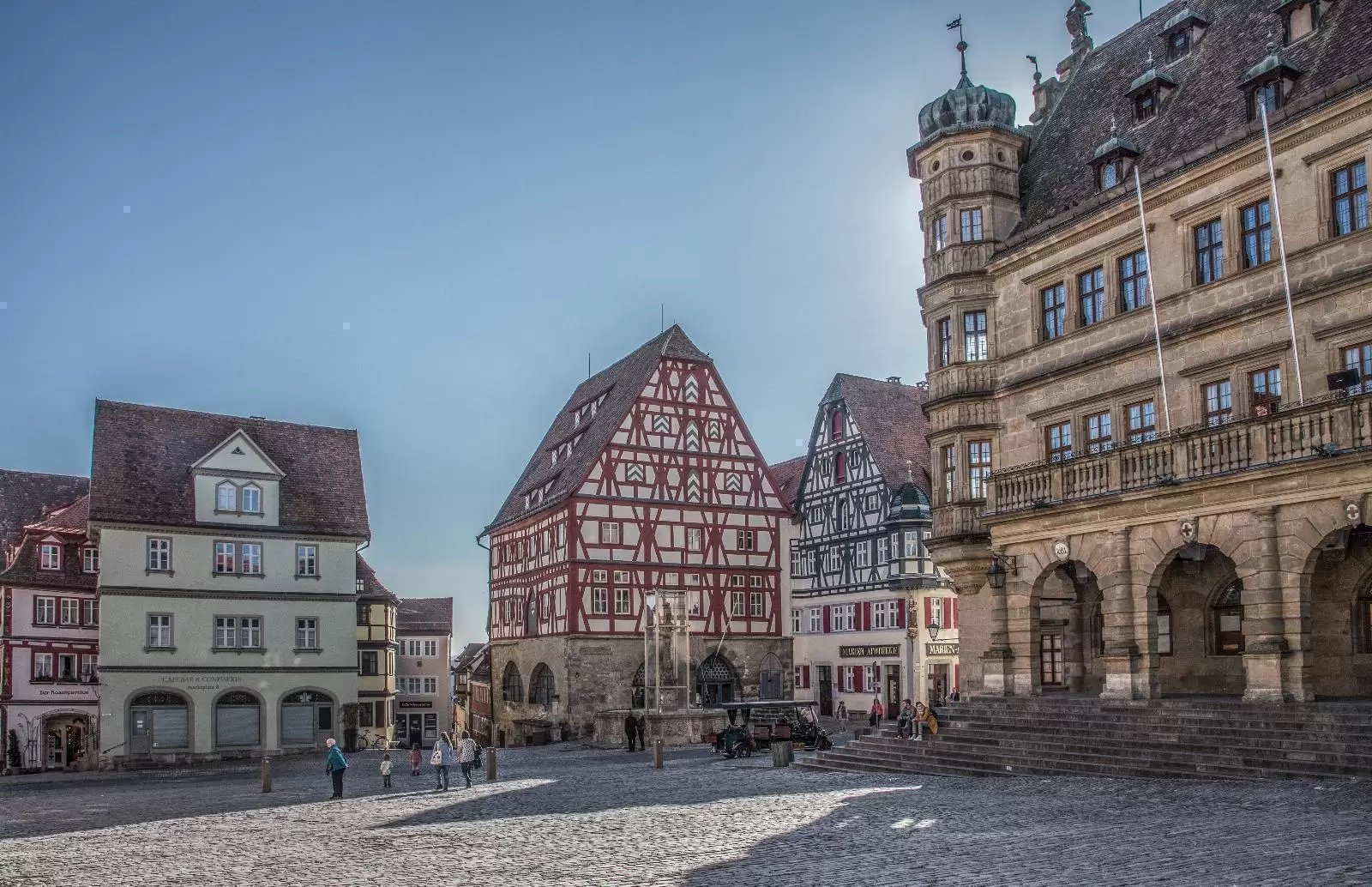 Wenn man das erste Mal durch die engen Gassen der Altstadt auf den Rothenburger Marktplatz kommt, überrascht der Anblick des imposanten Rathauses doch sehr. Der Bau im Stil der Renaissance mit seiner Schautreppe und der aufwändig gestalteten Fassade wirkt zwischen den umliegenden Fachwerkhäusern schon fast wie ein Schloss. Wo man in anderen Städten einen Ratskeller findet, gibt es im Rothenburger Rathaus eine Ratstrinkstube, die über dem Marktplatz thront. Einen einmaligen Ausblick über die Stadt bis hin zum Taubertal und der Frankenhöhe hat man außerdem von der bei Touristen sehr beliebten Aussichtsplattform des Rathausturmes, den man über 220 Stufen erklimmen kann.