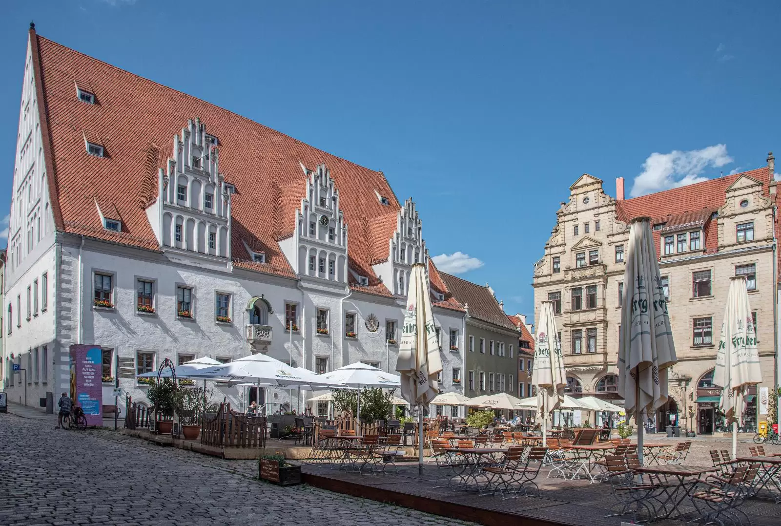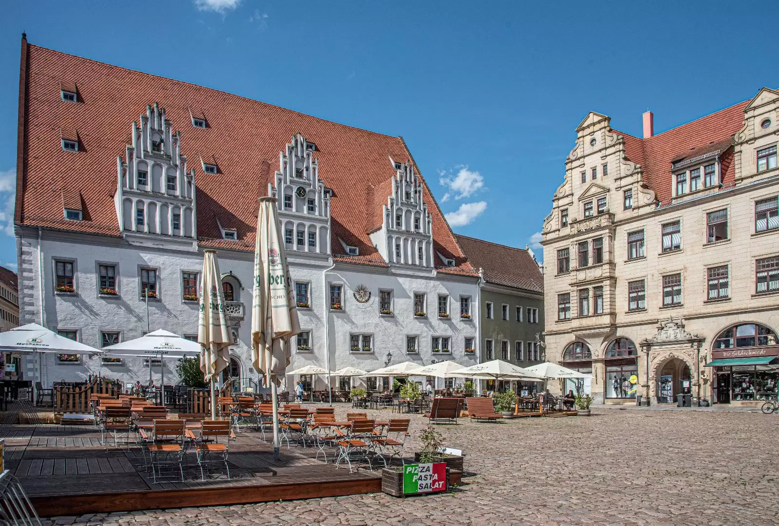 Meissen’s venerable town hall is located directly on the market square of the Saxon city. Built in the late Gothic architectural style, the imposing size of the building occupies the entire northern side of the market square. In the neighbourhood are equally impressive restored town houses, which indicate the prosperity of the town in recent centuries. The town hall itself was built in the course of the 15th century. An eye-catcher is the pointed-arched main portal with the town coat of arms made of sandstone and the two throats on both sides. Inside the town hall, the large council hall on the upper floor is particularly worth seeing. It has a wood-beamed ceiling resting on three stone pillars.