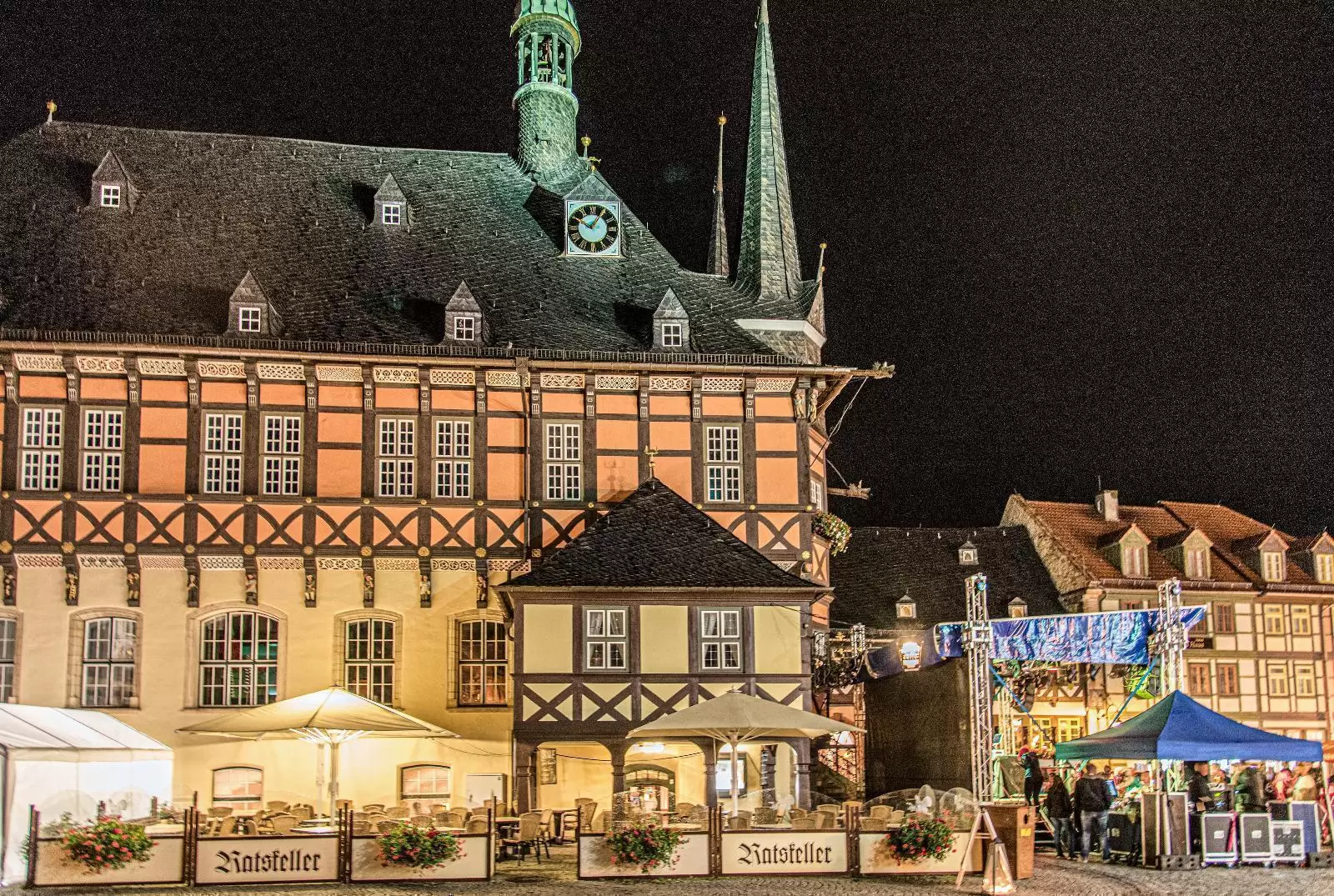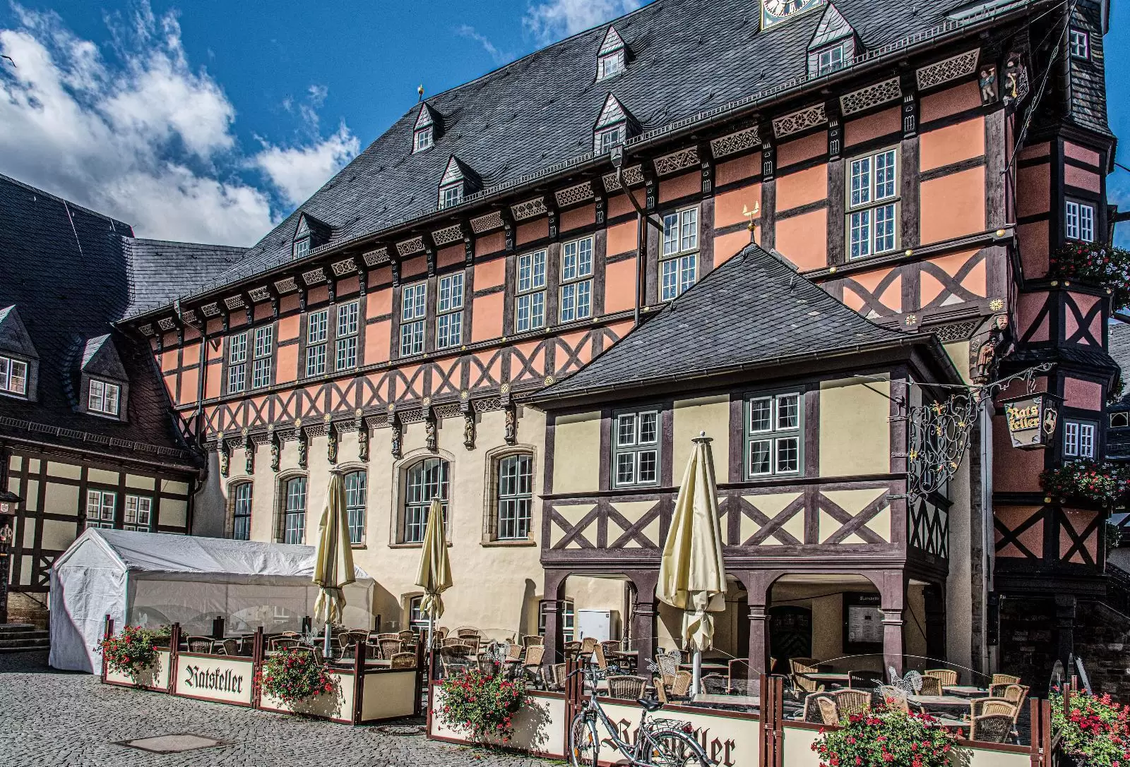 In the middle of Wernigerode’s market square is one of the town’s most famous buildings – the town hall from the 13th century. Until 1528, it officially served the counts of Wernigerode as a court house and playhouse until the last count finally donated it to the town in 1427. The town used the building for court hearings as well as for events and festivities. In 1494, a half-timbered storey was added before the building was converted into the town hall in 1530. The current state of the house as a late Gothic half-timbered building with its impressive wooden figures depicting craftsmen, jesters and saints dates from this time.
